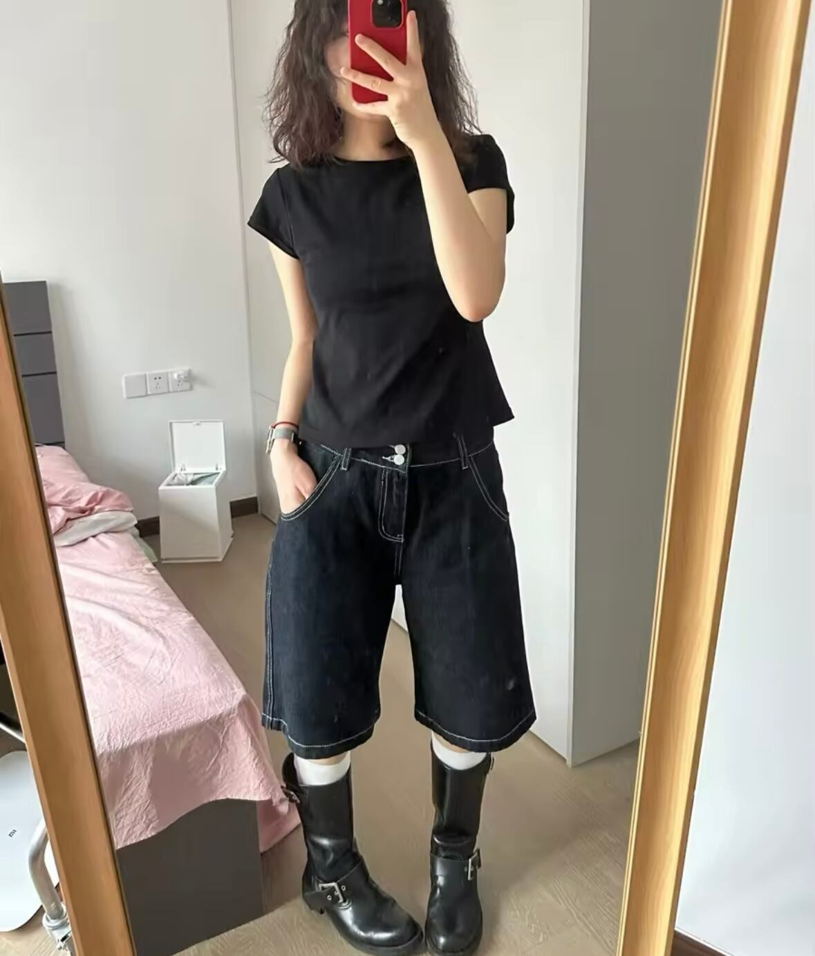#ハイウエスト #ワイドレッグ #デニムショーツ #カジュアルルーズ