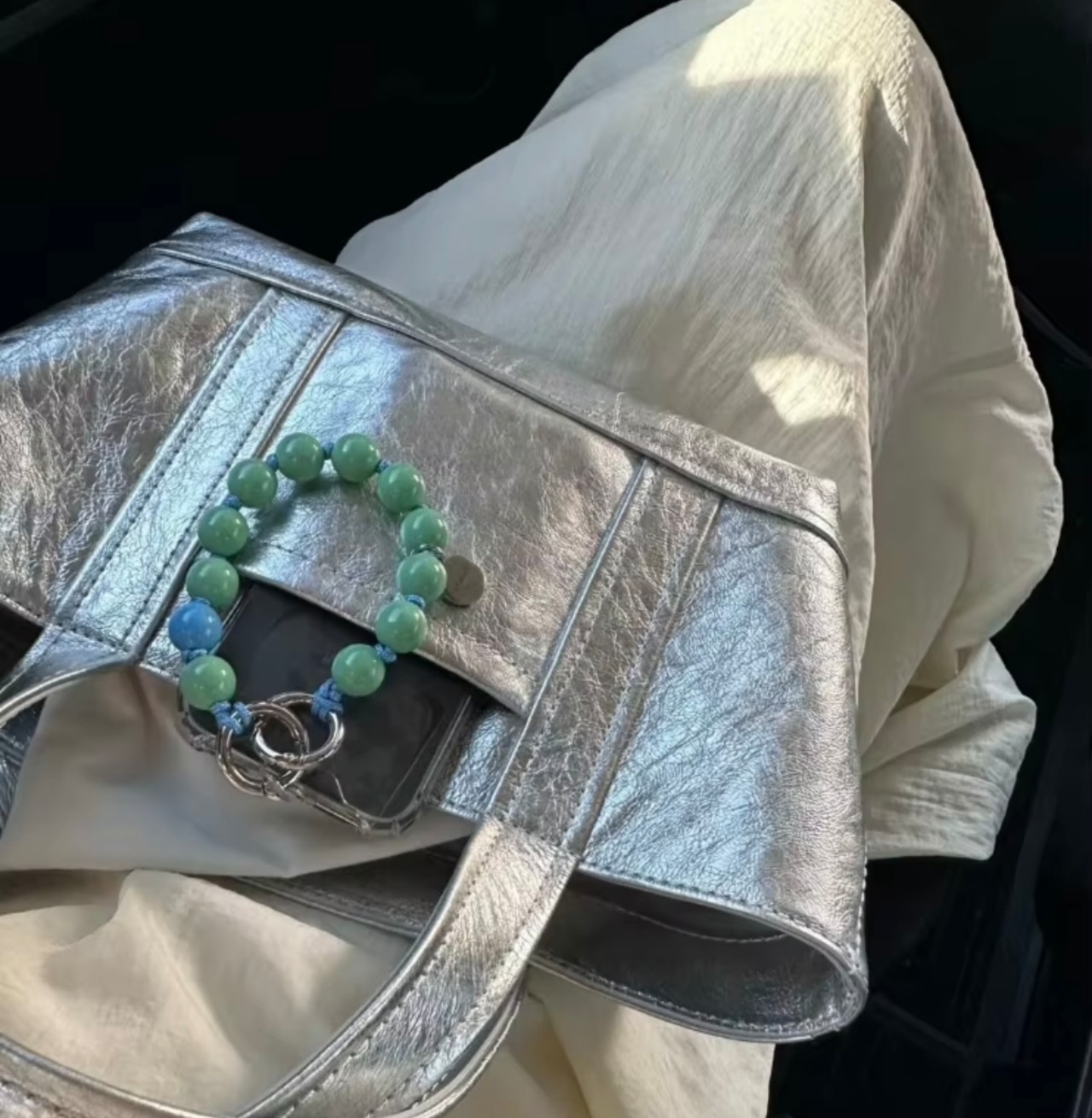 - 上質なシルバー素材を使用したこのトートバッグは、大容量でたっぷり収納できるため、通勤や休日の外出にも最適です。ファッショナブルなデザインが特徴で、カジュアルなスタイルにもマッチし、あなたのファッションに華を添えます。