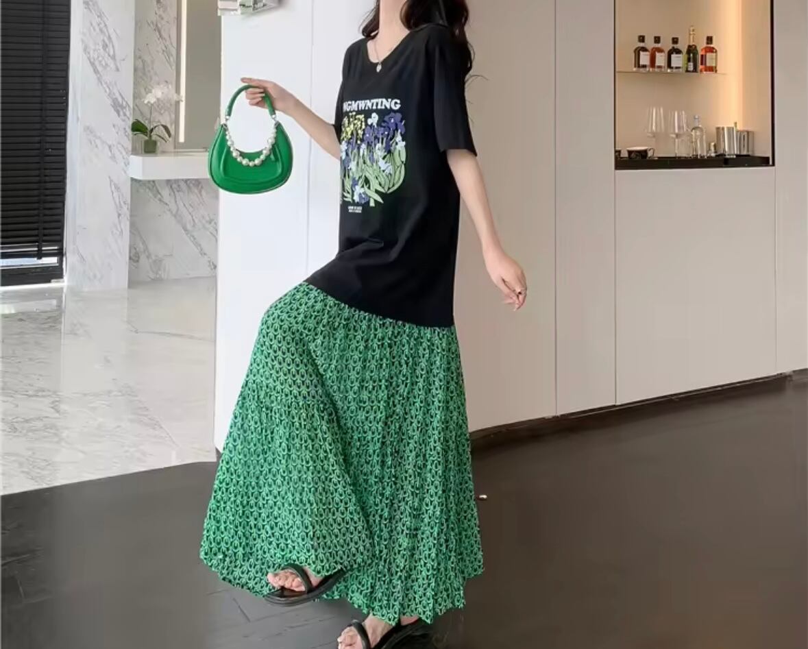 #ロングワンピース #パッチワークドレス #ルーズビルス #スプリットヘム #半袖 #プラスサイズ