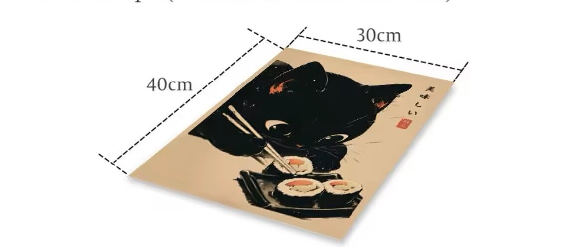 特別な瞬間を演出する、レトロなかわいい動物プリントポスター!日本の寿司をテーマにしたこのアートは、シェフの黒猫が愛らしくトークを交わす様子が描かれており、キッチンやバーのインテリアにぴったりな一品です。ユニークなデザインが、お部屋を魅力的に彩ります!