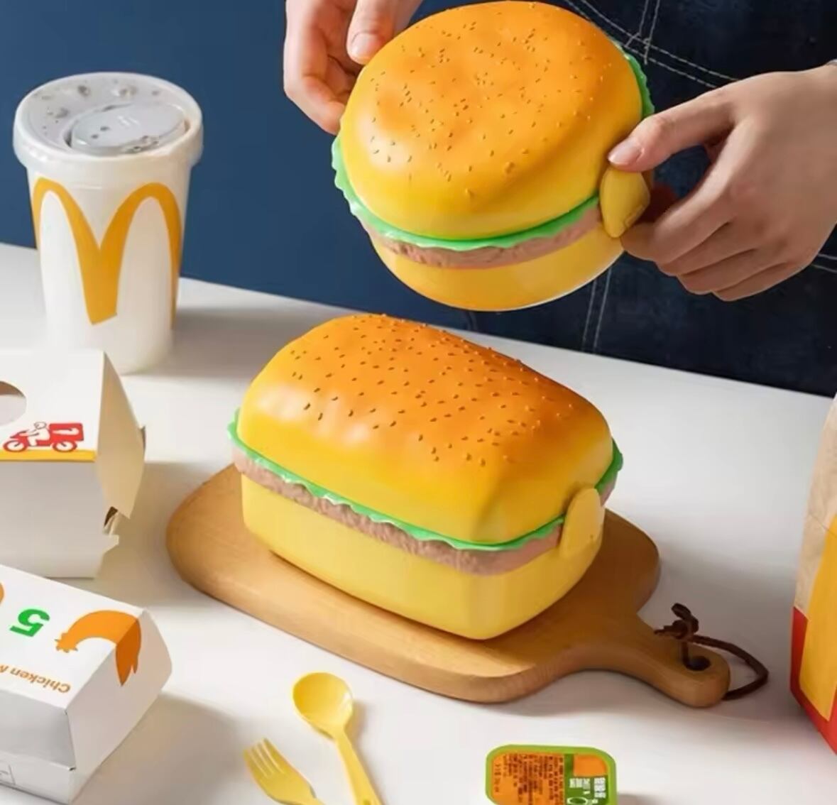 この「ハンバーガー弁当箱二段」は、かわいいハンバーガーデザインが特長で、子供たちのお弁当を楽しく彩ります!鮮やかな色合いは、お昼の時間を華やかに演出し、食欲をそそる魅力満載のアイテムです。学校やピクニックにぴったりで、友達に自慢したくなる可愛さです!