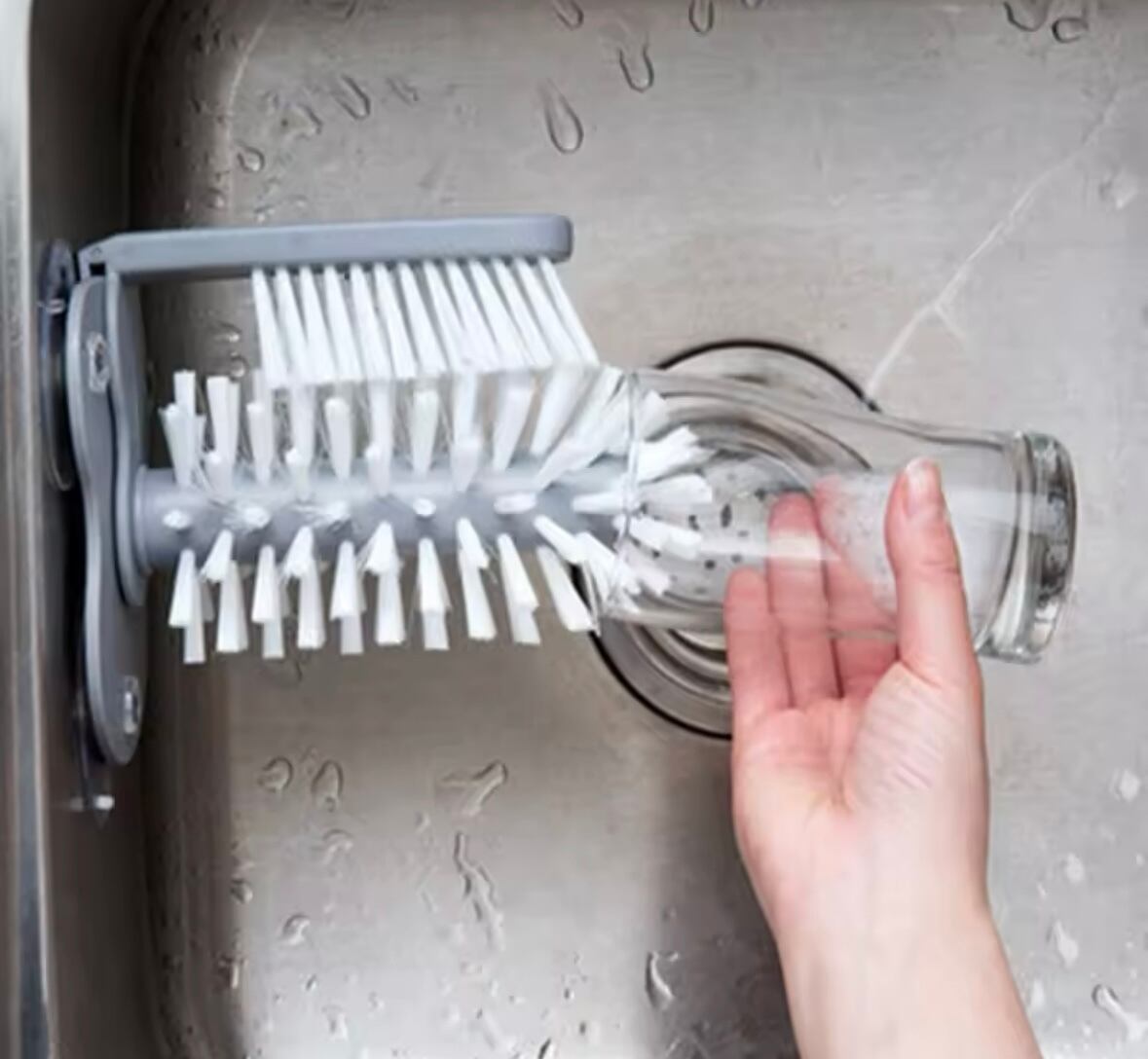 このブラシがあれば、手の届きにくいグラスの底や、細長い形状のボトルも、力を入れずに簡単に綺麗に洗うことができるんです。中央のブラシが内側を、周りのブラシが外側を同時に洗ってくれるので、あっという間にピカピカになりますよ。