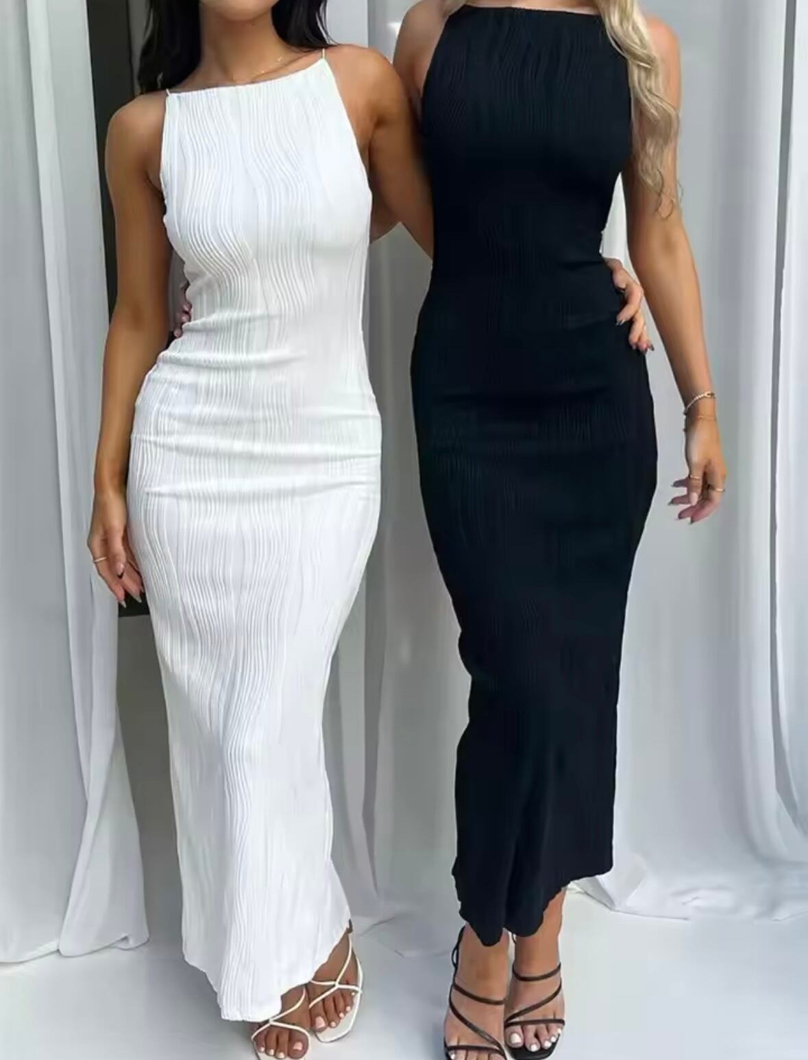 このドレスは、軽やかで着心地の良い素材で仕立てられており、快適さを保ちながらスタイリッシュな印象を与えます。ノースリーブとスリットバックの仕様が魅力的なポイントで、動きやすさとセクシーさを両立。特別な夜のデートや友達とのパーティーにぴったりの一枚です!
