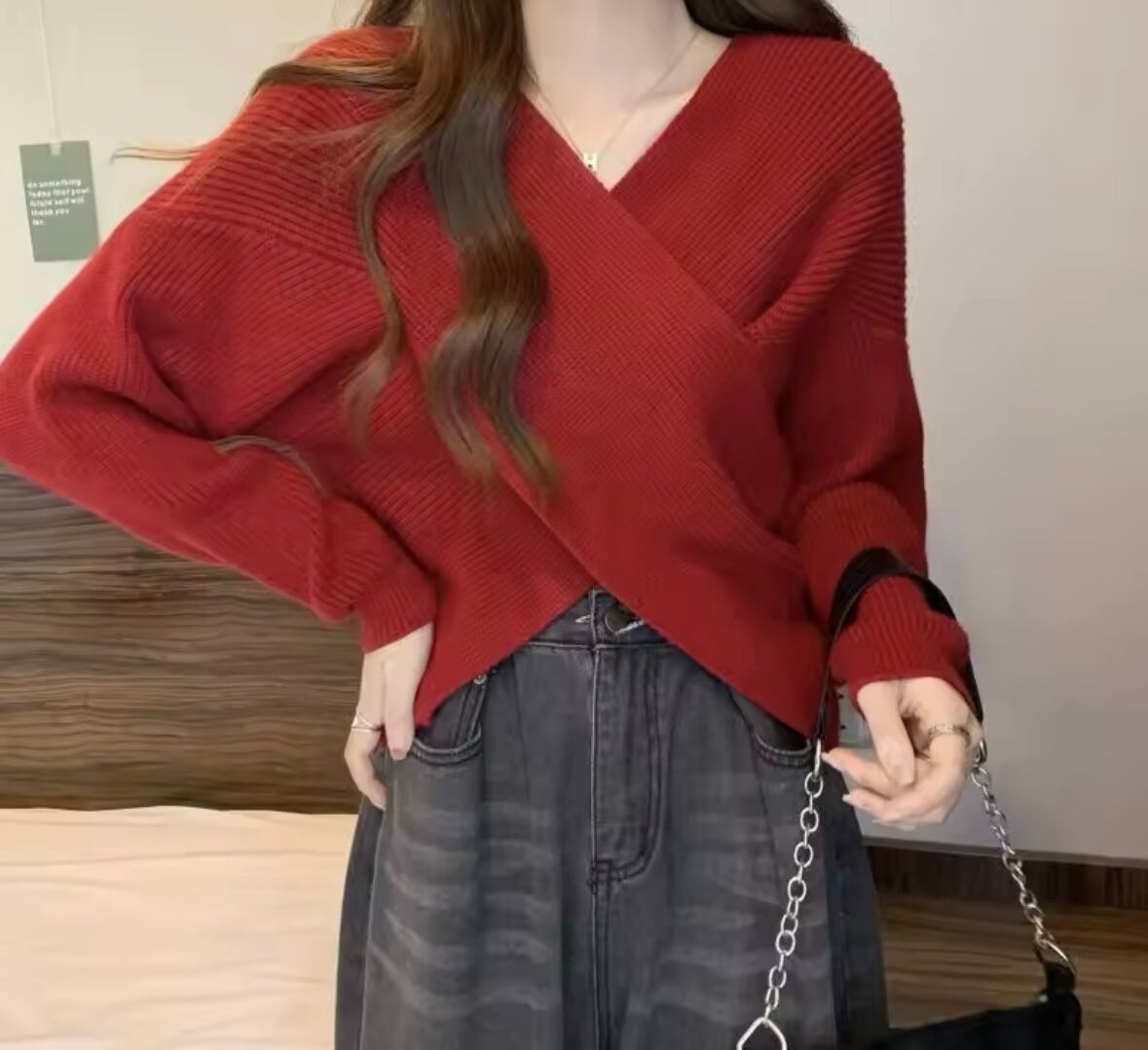 #クロスニットセーター #単色セーター #Vネック #長袖 #プルオーバー #クロップトップ #ストリートウェア #エレガント #ジャンパー #ファッション